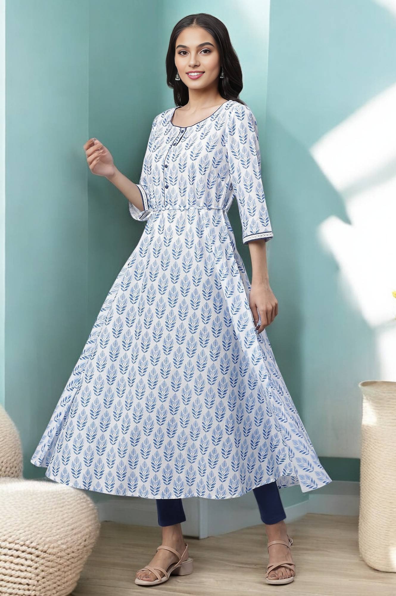 Blue Floral Printed Anarkali Kurta with Embroidered Neck