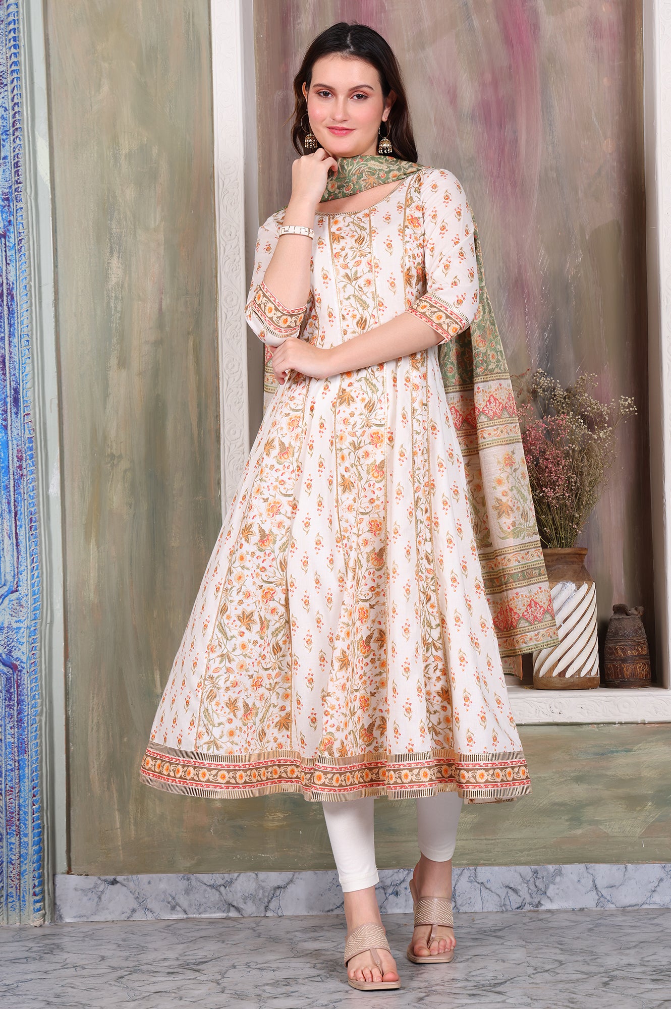 Off White Floral Printed Tape Embellished Anarkali Cotton Kurta, Leggings and Dupatta Set