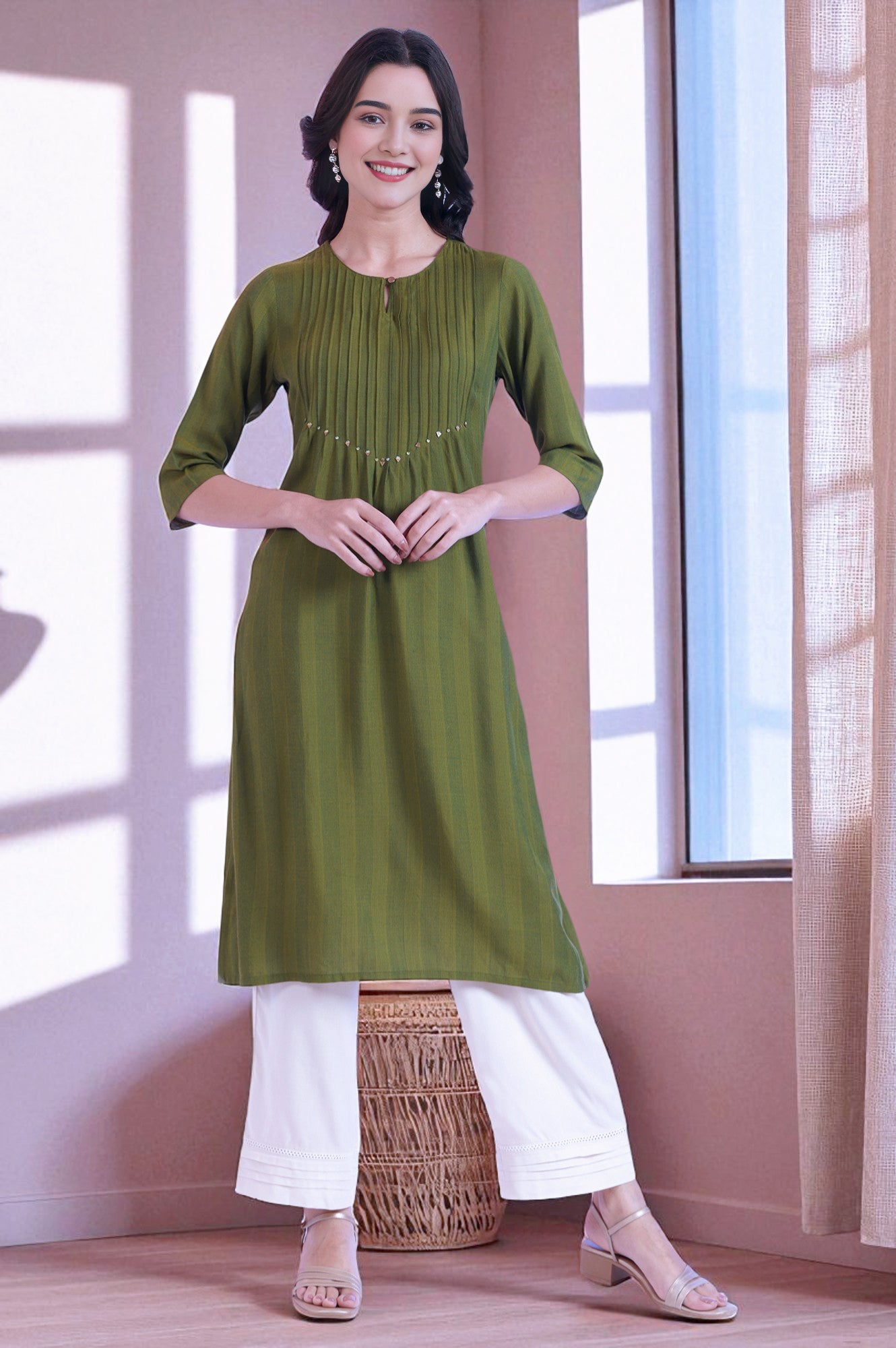 Green Yarn Dyed Straight Cotton Blend Kurta