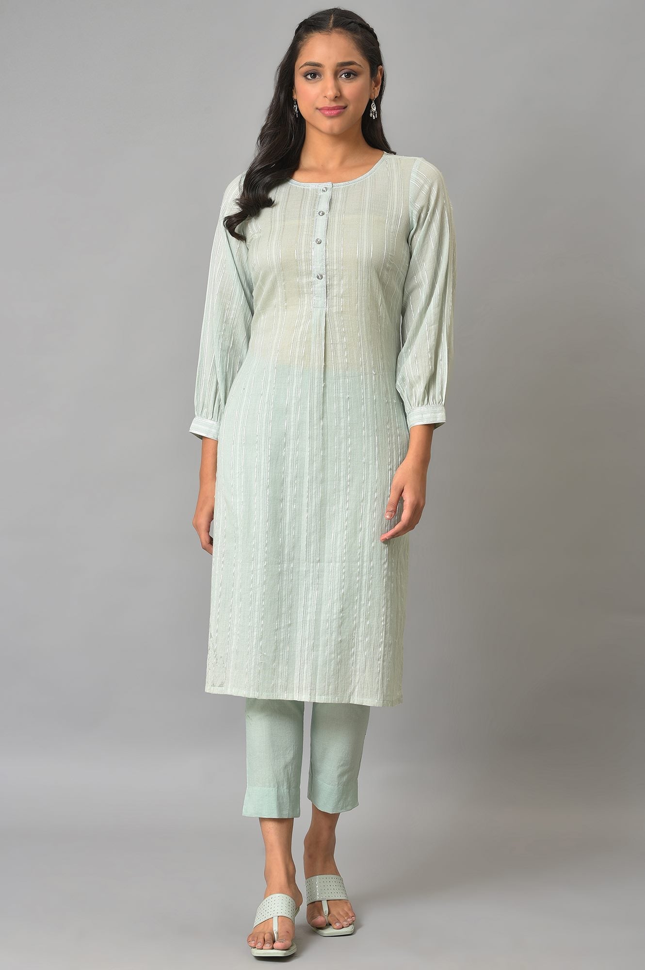 Aqua Green Leno Stripe Kurta and Trousers Set