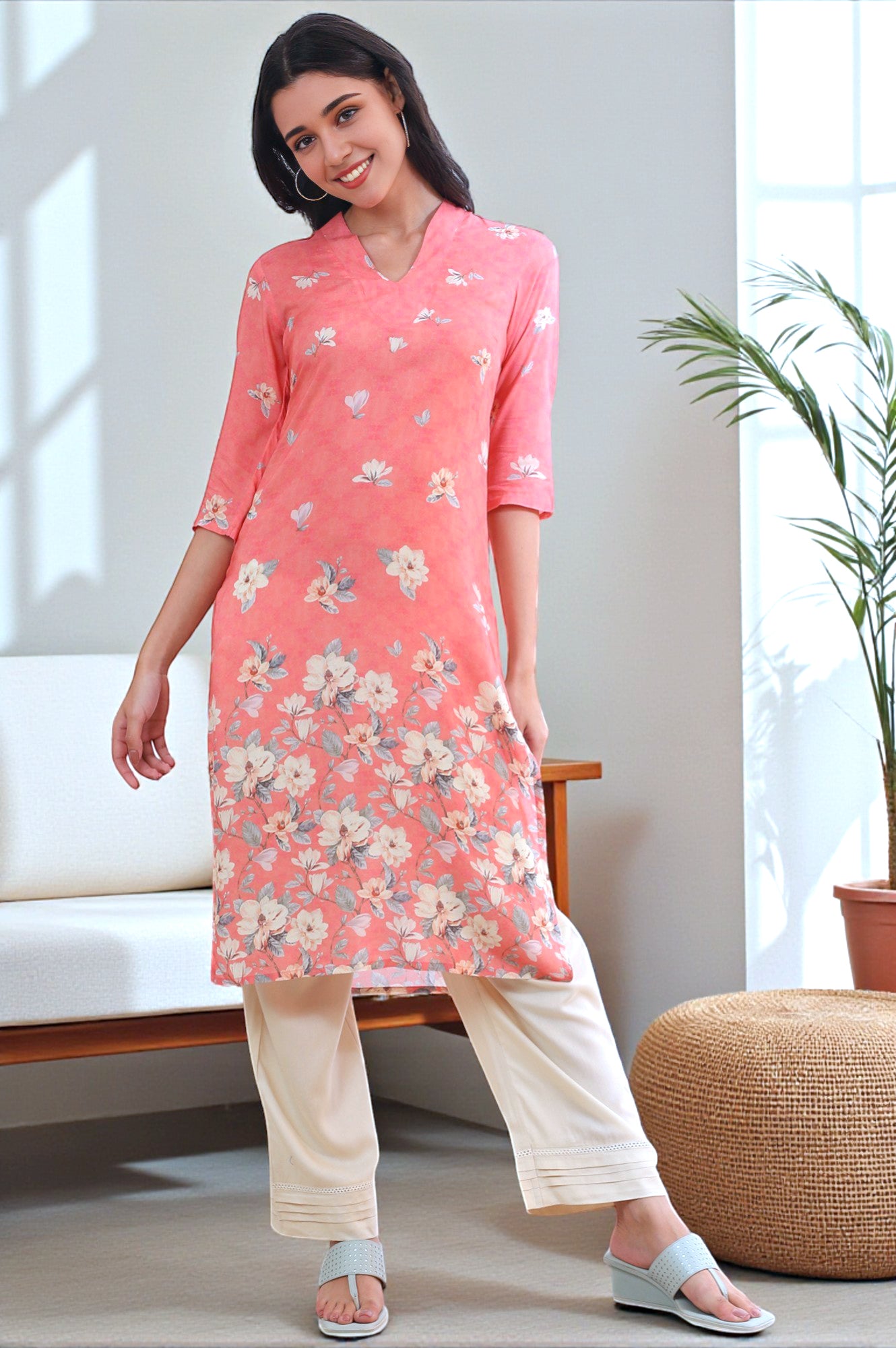 Girls LIVA Pink Floral Printed kurta with Blue Trousers and Pink Dupatta