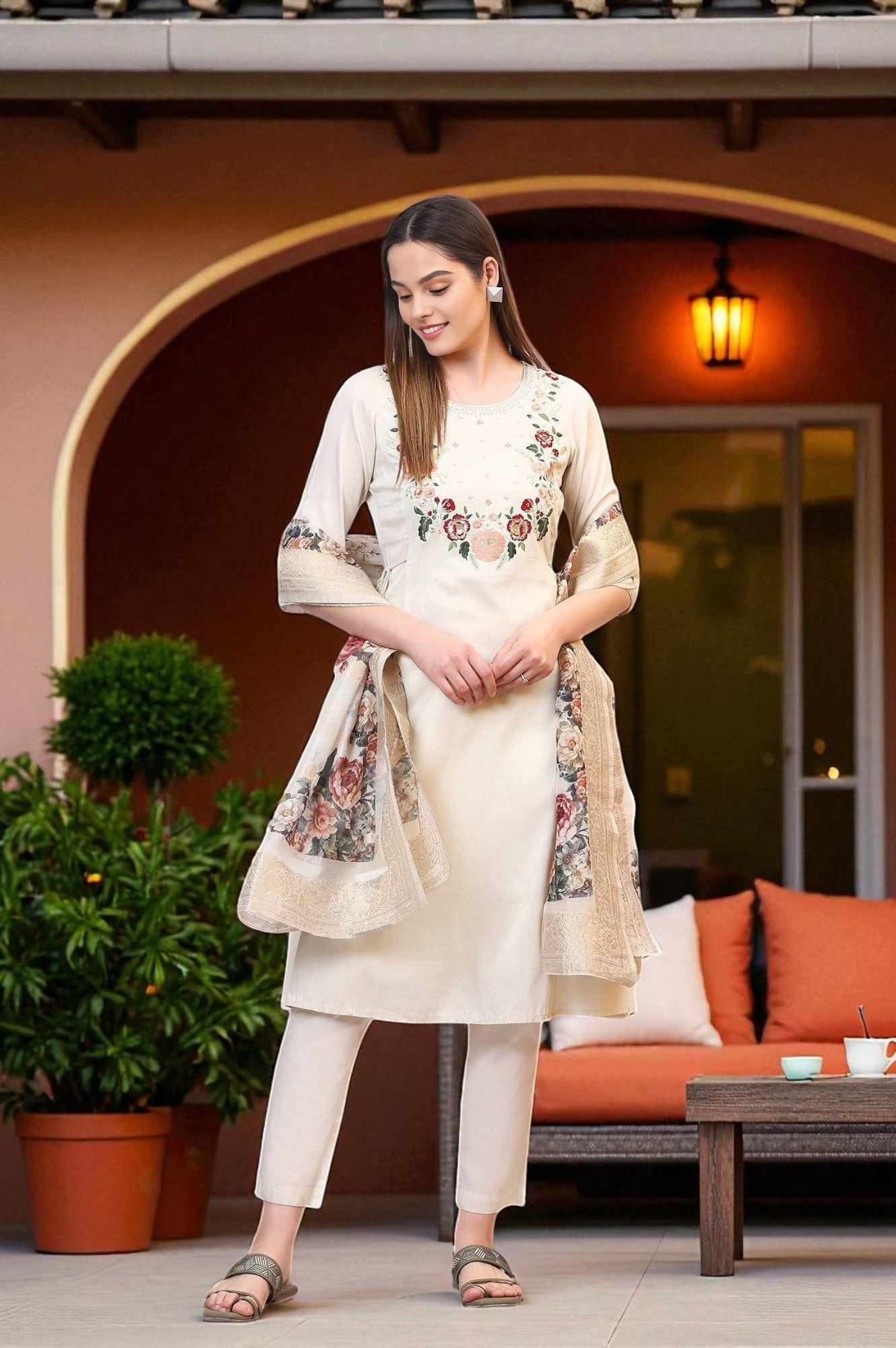 White Floral Printed Flared Anarkali Dress and Dupatta Set