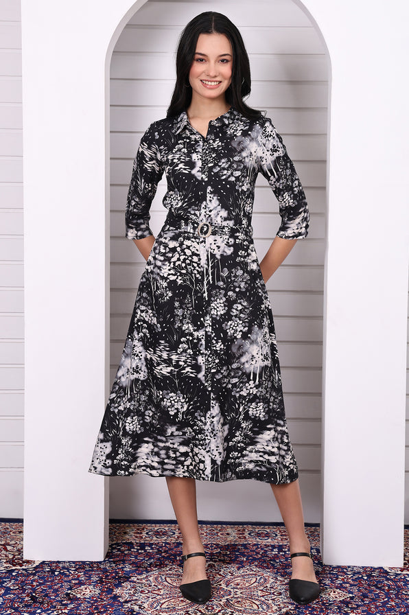 Crafted in a fluid, soft-touch fabric, this dress features an all-over floral print in muted tones that pop against the deep black base. The flared silhouette adds movement and charm, while the detachable waist belt defines the shape for a flattering fit. With 3/4th sleeves and shirt collar neckline, this floral print black flared dress is an ideal choice for casual outings, day events, or weekend getaways. Its above-knee length and easy fit make it a chic fusion of Indian motifs and modern style.