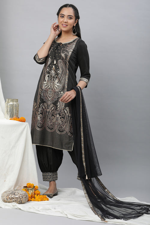 A stylised short kurta paired with fashionable embroidered salwar and sheer dupatta. With 3d printed motifs and minimal sequin embroidery, the style looks very elegant and perfect for any evening wear.
