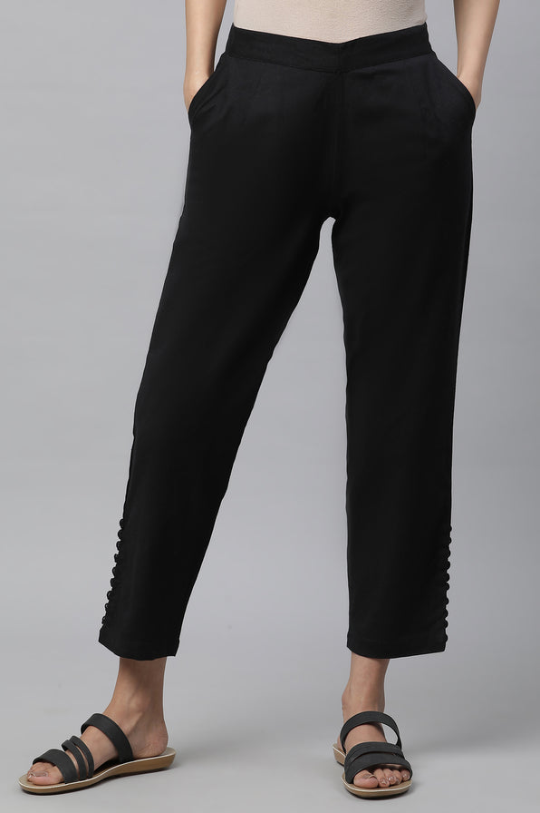 Black Solid Straight Fit Cotton Pants With Button Detail