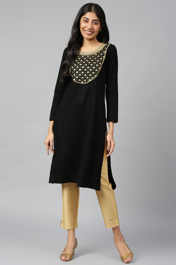 Keep Your Casual Look On Point With This Stylish Straight Solid Knitted kurta In Black Colour. This Slip-On kurta Has Round Neck And Full Sleeves.