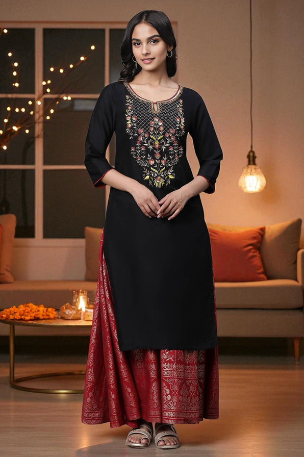 Indulge in the timeless elegance of this classic black coloured embroidered kurta, made with a viscose poly fabric for a rich and lustrous look. The round neck is accentuated with cutout and tab detail, enhanced with contrast piping for a chic look. The intricate embroidery work adds a touch of sophistication to the overall design.