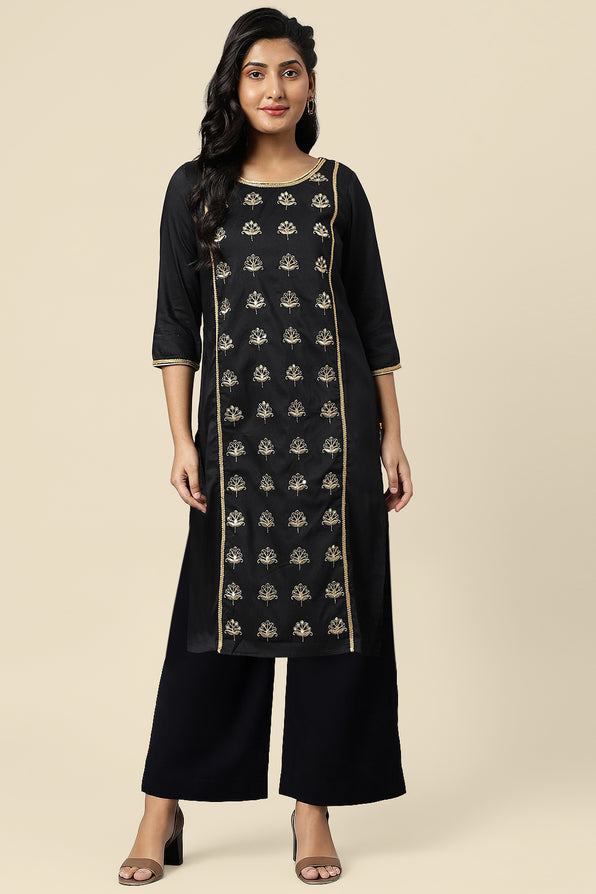 This black viscose blend kurta and palazzo set is highlighted by intricate zari embroidery, creating a luxe statement. The straight silhouette balances richness with simplicity, making it apt for evening gatherings or celebratory events. The viscose blend offers fluidity while maintaining formality.