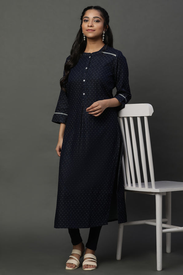 Elevate your style with our denim bobby kurta providing a textured and unique appearance.It showcases a smart mandarin collar, a self placket detail, and an inverted box pleat for added sophistication. Unique ladder inserts on the shoulder and sleeves add a trendy touch, and the denim wash look ensures a comfortable and relaxed appearance.