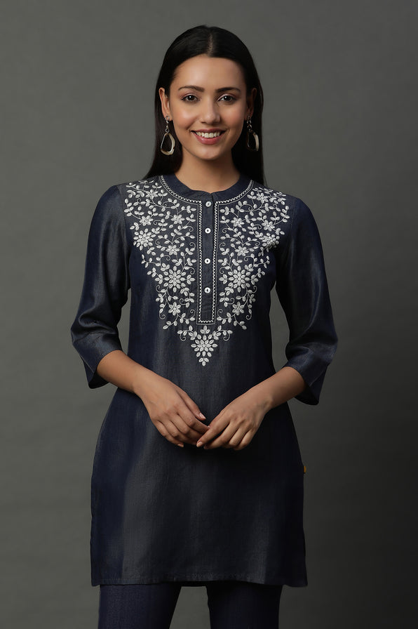 Blue Floral Embroidered Cotton Kurti