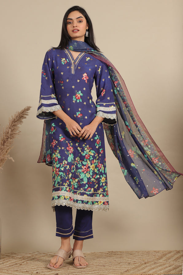 This elegant 3-piece kurta set includes a classic blue long A-line kurta with side slit with a V-neck with placket, bell sleeves. It features intricate placement prints adorned with gold laces. The kurta is pairs beautifully with narrow palazzo bottoms featuring matching laces. The look is completed with a lightweight multicolored printed drape in Kota fabric, perfect for festive occasions!