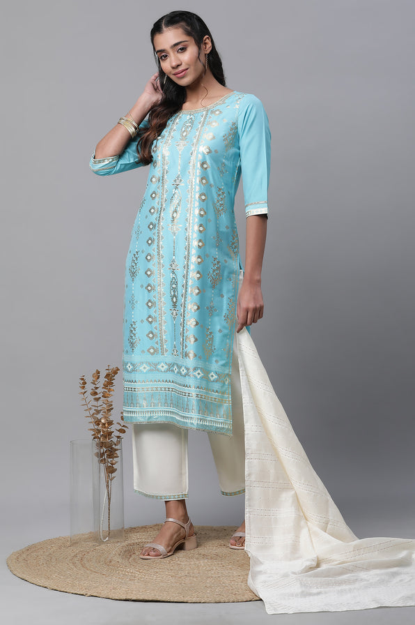It is a very budge friendly set with all the sophistication and drama. Imbued in festive tone of blue, this kurta has viscose rich fabric straight pants and special customised drap. You will surely earn compliments whenever its worn.