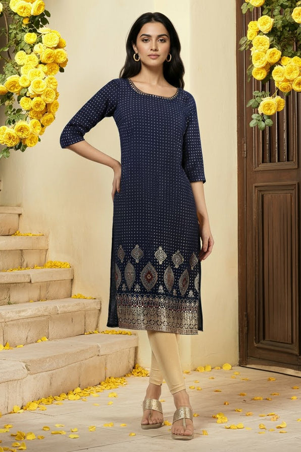 Blue Printed Sequins Straight Kurta