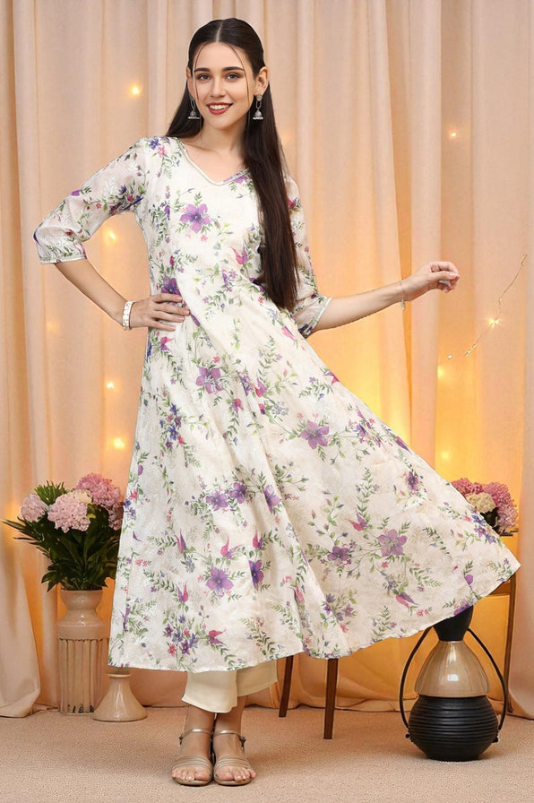 This elegant Kalidar Kurta features a V-neck and 3/4th sleeves with lace patches, adding a refined touch. The cream base is decorated with purple floral bunches and a gold allover print, creating a vibrant yet subtle look. Made from lightweight Kota fabric with lining, it offers both comfort and structure, making it perfect for festive occasions.
