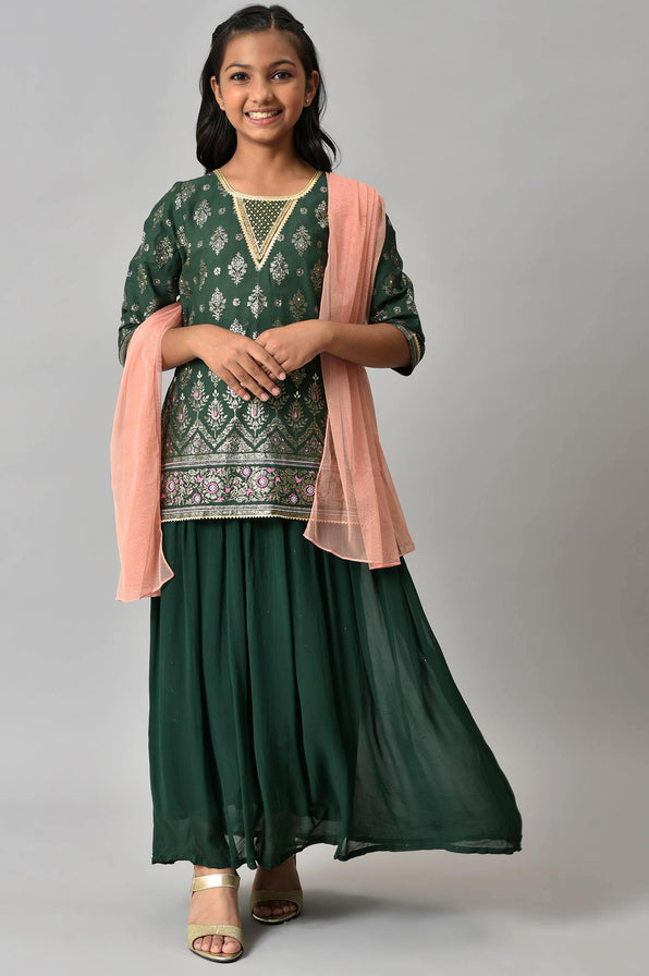 Girls Green Embroidered Festive Dress With Peach Dupatta