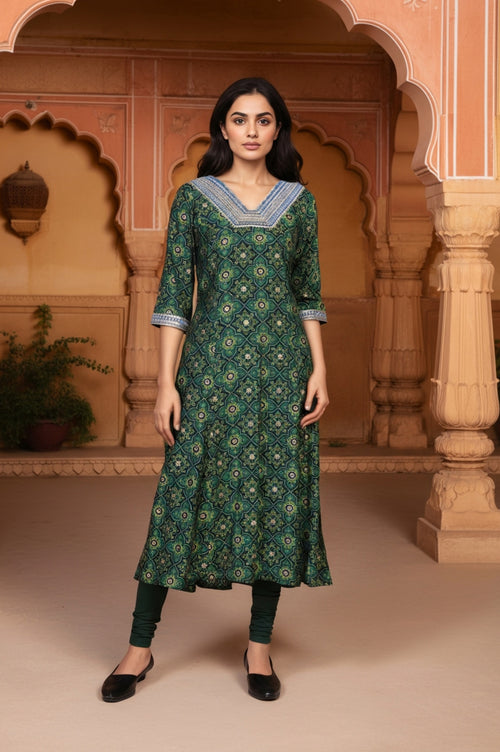 Style this green A-line kurta with silver jhumkas and metallic bangles for a festive look. Pair it with embellished juttis and a matching clutch for a complete ethnic ensemble. Add a lightweight shawl for cooler evenings.