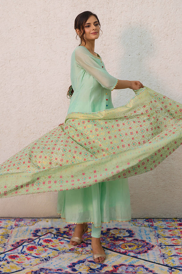 Look gorgeous in this beautiful anarkali set, suitable for all occassions. The anarkali is made in rich chanderi fabric with multi-coloured buttons and is paired with a matching muti-coloured printed dupatta.