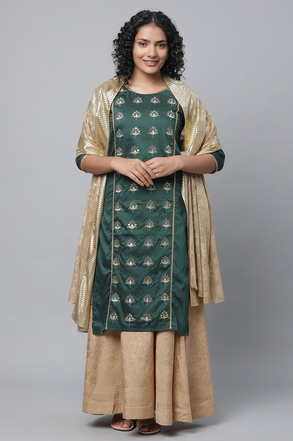 Look Stunning And Stylish In This Pretty Aurelia kurta Set. The Set Has Green Embroidered kurta In Round Neck And Straight Silhouette. It Is Paired With Golden Skirta And Dupatta.