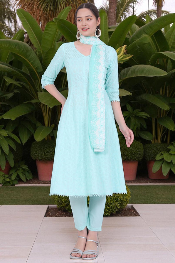 Discover the perfect blend of tradition and modernity with this exquisite mint green ethnic set from Aurelia. Crafted from 100% pure cotton, this flarred anarkali set offers unparalleled comfort and breathability. The v-neck design and three-quarter sleeves add a touch of elegance, while the intricate schiffli work showcases exceptional craftsmanship. This fusion ensemble, comprising an anarkali kurta, trousers, and dupatta, is ideal for special occasions. The woven construction ensures durability, making it a valuable addition to your wardrobe. Hand-wash recommended to maintain its pristine condition. Embrace the fusion of style and comfort with this stunning Aurelia creation.