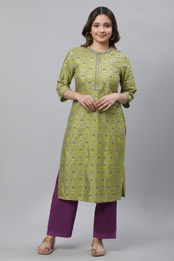 Step into the spotlight with this green foil printed women kurta set, designed to bring a festive glow to your ethnic wardrobe. The straight-fit kurta features delicate foil printing and subtle embellishments that add a hint of shimmer without overwhelming the look. Paired with a contrasting purple palazzo, the set offers a comfortable yet graceful silhouette suitable for both celebrations and evening events. Crafted from soft, breathable fabric, this embellished kurta set combines elegance with ease, making it a perfect choice for women seeking a refined yet festive Indian outfit. The vibrant green tone and metallic detailing elevate this ensemble into a versatile partywear essential.