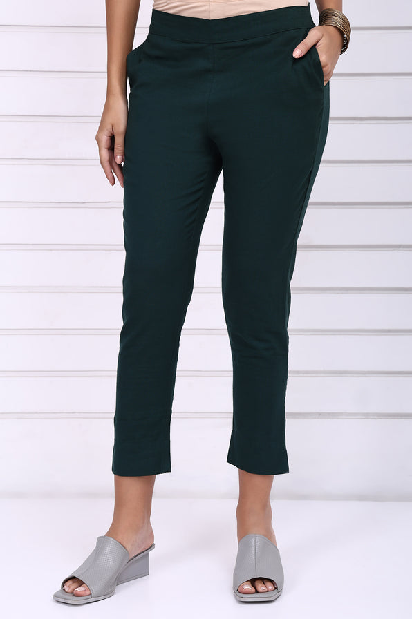 Infuse everyday style with earthy freshness through these solid green trousers. Tailored in mid-rise form and constructed from cotton, they offer just the right amount of structure without compromising comfort. The solid color makes them a great pairing piece, while the mid-rise fit flatters a range of silhouettes. Perfect for casual Fridays or running errands in style, these trousers bring subtle polish to your rotation.