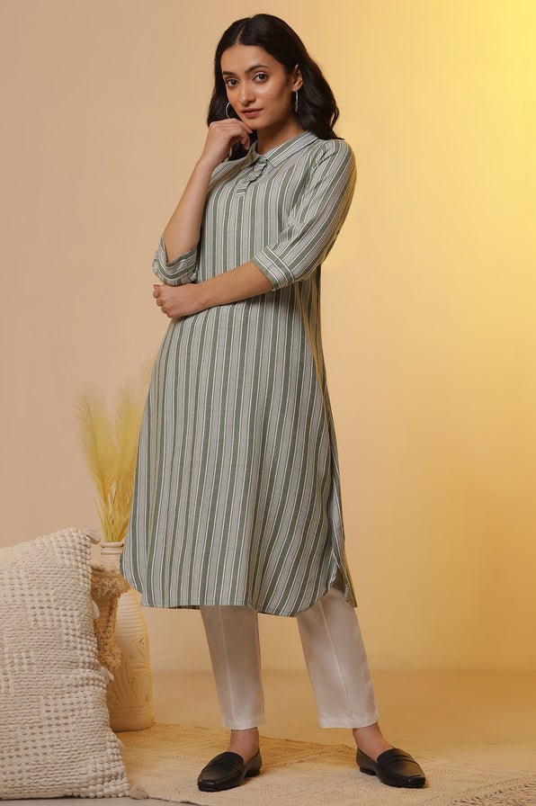 Curated in breathable textured twill, this kurta is tailored with ease for daily activities. It features a smart shirt collar with a horizontal- striped short placket, sleeve cuff and back yoke.The kurta comes with white straight fit trouser pants.
