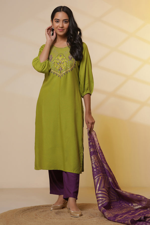 Immerse yourself in regal elegance with our green zari embroidered kurta Set. The kurta, crafted in a rich green hue, features exquisite zari embroidery that adds a luxurious, shimmering detail to the fabric. It is paired with a striking purple palazzo, offering a bold contrast and a flattering, flowing silhouette. The ensemble is completed with a matching dupatta, intricately designed to complement the kurta with its delicate embroidery. This set is perfect for festive occasions or special events, effortlessly combining vibrant colors with intricate craftsmanship for a sophisticated and stunning look.