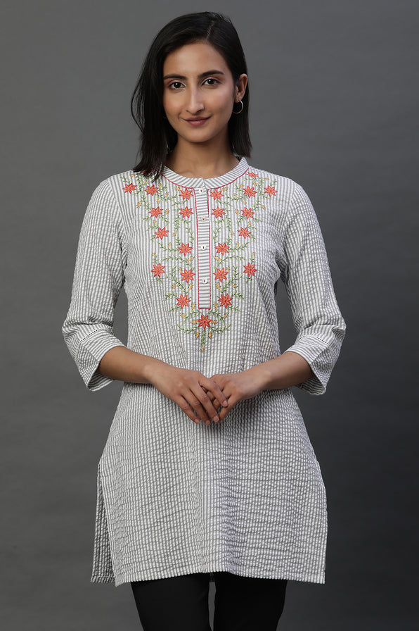 Grey and White Thread Embroidered Short Kurti