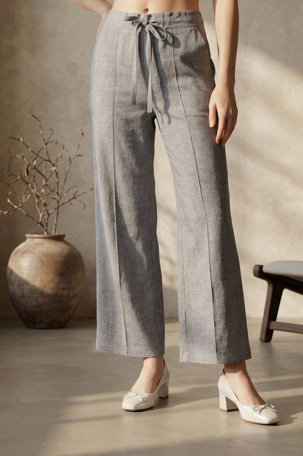 Crafted in a solid grey wash, these wide-leg denim palazzo pants for women bring effortless style to your casual and semi-formal wardrobe. Featuring a high-rise waist with a comfortable drawstring and partially elasticated band, this versatile westernwear piece ensures a relaxed fit throughout the day. The woven ankle-length silhouette is detailed with subtle pintucks, a refined front seam, and handy slant pockets for a highly functional yet polished look. Whether you are dressing up for a smart casual office environment or heading out for relaxed college wear, this straight denim palazzo pairs seamlessly with your favorite topwear to create a chic, everyday aesthetic.