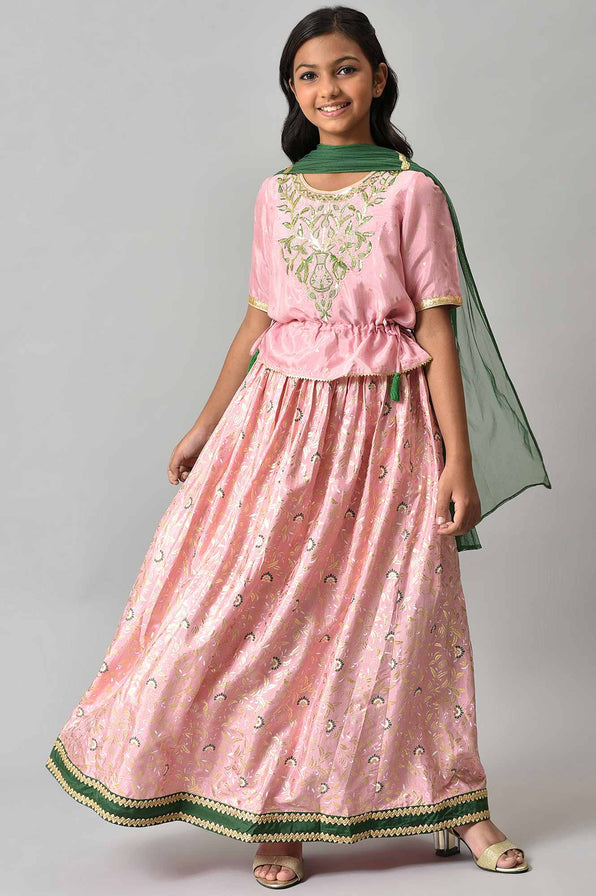 Crafted In Zephr Colour, This Stylised Top With Skirt Is Peppered With Beautiful Coloured Zari And Sequin Embroidery And Foil Printed Florals. Dailing It With Contrast Stylised Dupatta And Tassel Detail Adds The Perfect Charm. This Is A Must Have Style You Shouldn'T Miss This Season.