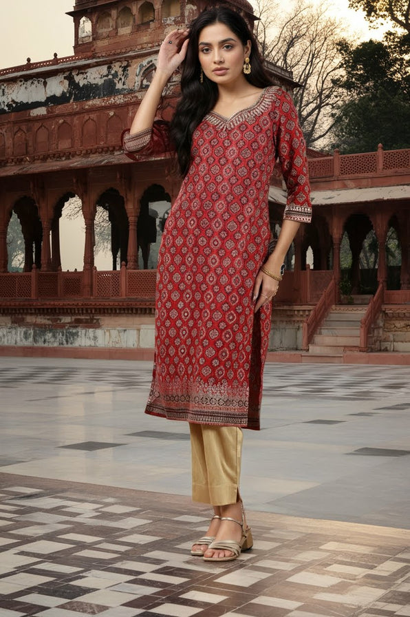 Wear this kurta for a classic timeless elegance in any festive occasion where its gold heavy chunky neck embroidery stands out to create a wholesome look, you can pair this up with gold tights or tonal colour palazzo along with gold drape for a stunning look. Together, these elements create a harmonious fusion of tradition and contemporary style, making this kurta a statement piece for any occasion.