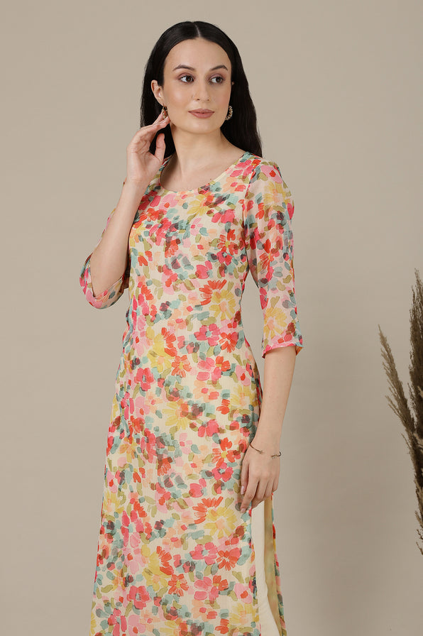 A Cluster of floral elegance in multicolour hues is a must have season for your wardrobe, exclusively curated for you to elevate your confidence. This piece has a round neck and a simple straight silhouette for a simple elegant appeal. You get the freedom to choose from various colours of bottom and drape to go well with this.