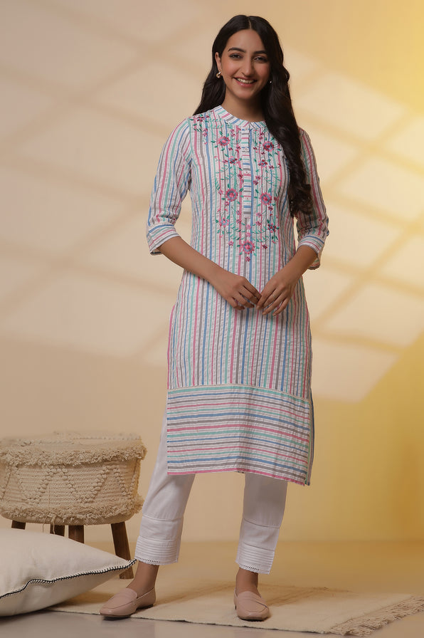 Multi-coloured Striped Cotton Lurex Embroidered Kurta and Pants Set