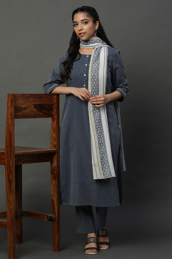The three piece dobby kurta set is a versatile ensemble. The kurta features a round neck with a mock placket, cuff details, and contrasting piping for added style. It comes with coordinated bottom in self-fabric and a contrasting dobby dupatta, completing the look with a touch of elegance and coordination.