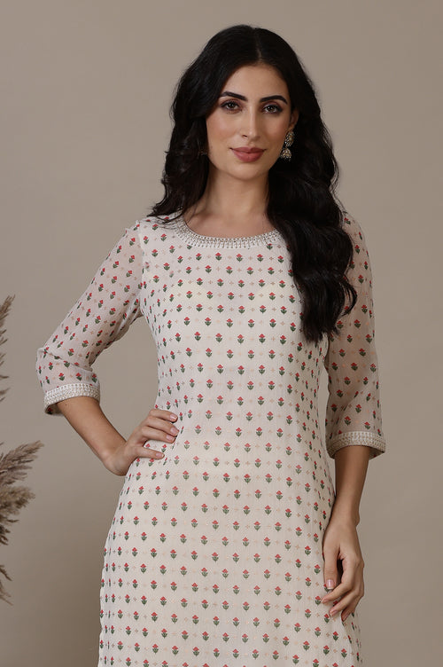 A timeless blend of elegance and charm, this off white floral printed kurta for women is crafted in lightweight chiffon fabric. The straight silhouette is adorned with sequined accents, adding a festive sparkle to its design. Featuring a round neckline and three-quarter sleeves, this kurta is perfect for semi-formal gatherings and festive occasions. The slip-on closure ensures effortless wear, while the delicate floral print exudes sophistication. Pair it with gold-toned trousers and statement accessories for a complete look.