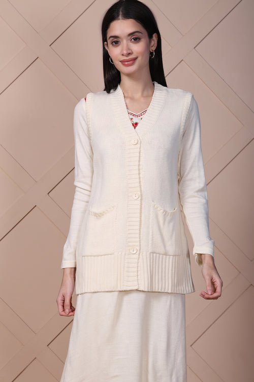 A timeless embrace of comfort, this elegant sweater for women redefines classic layering and becomes an instant wardrobe staple. Crafted in a soft, creamy hue that evokes quiet sophistication, its gentle acrylic knit promises both warmth and a wonderfully soft touch against the skin. This beautiful cardigan for women is designed with a graceful V-neckline that descends into a clean, button-front placket, creating a versatile silhouette that's perfect for both casual coffee dates and polished office ensembles. The full-length sleeves offer cozy coverage for cooler days, ending in simple, neat cuffs that maintain the minimalist aesthetic. You'll appreciate the thoughtful details, like the two perfectly placed patch pockets on the front that blend everyday functionality with a relaxed, approachable charm. The back is not forgotten, revealing a subtle, textured knit pattern on the yoke, adding a touch of understated design interest. Its straight shape and completely opaque fabric ensure a flattering, comfortable drape that never clings. The design is grounded by a substantial ribbed border along the hemline and placket, providing a classic, structured finish. As a quintessential v-neck layering sweater, this piece is the essential you've been searching for, offering endless styling possibilities for year-round wear. It’s the perfect companion over a floral dress or paired with tailored trousers for an effortlessly chic look.