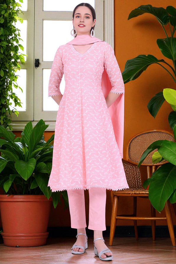 Elevate your ethnic wardrobe with this exquisite Aurelia fusion set. Crafted from a comfortable cotton blend (87% cotton, 13% nylon), this three-piece ensemble features an anarkali, trousers, and a dupatta. The peach-colored set boasts intricate schiffli detailing, adding a touch of elegance to your special occasions. The anarkali top showcases a flattering v-neck and three-quarter sleeves, while the flared silhouette creates a graceful flow. Hand-wash recommended to preserve the delicate craftsmanship. This woven set seamlessly blends traditional and contemporary styles, making it a versatile choice for various events. The cotton blend fabric ensures breathability and comfort throughout your wear.