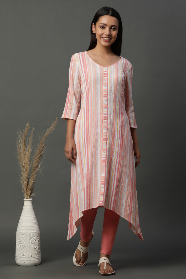 Pink Asymetrical Stripe Printed Cotton Kurta