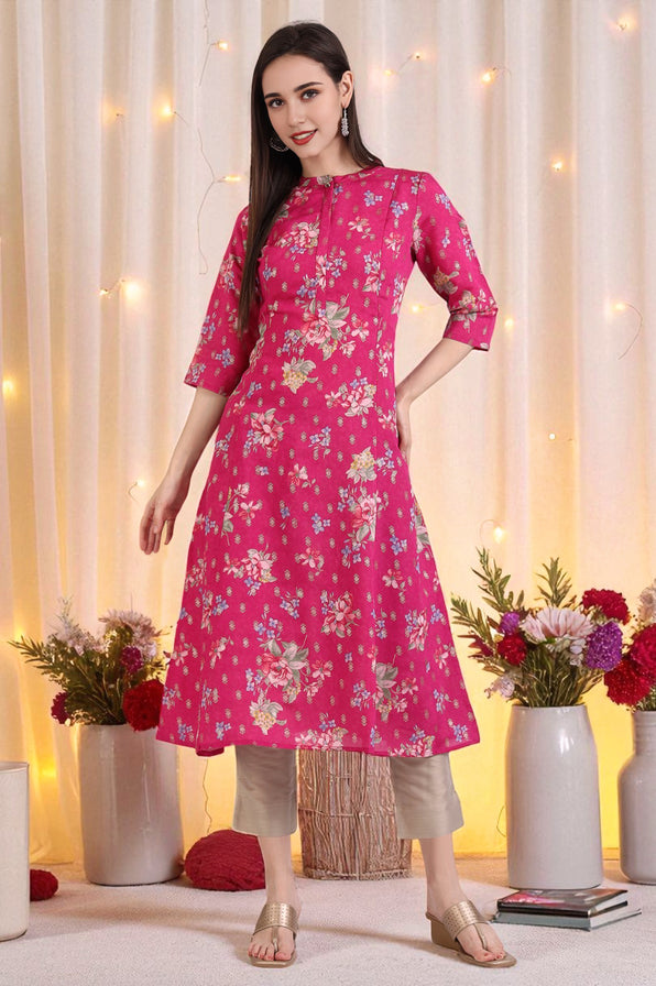 This beautiful A-line kurta features panels with a stylish mandarin collar with a placket, offering a contemporary twist. The 3/4th sleeves add a touch of elegance, while the vibrant multicoloured floral print on a bold pink base brings a fresh, cheerful vibe.