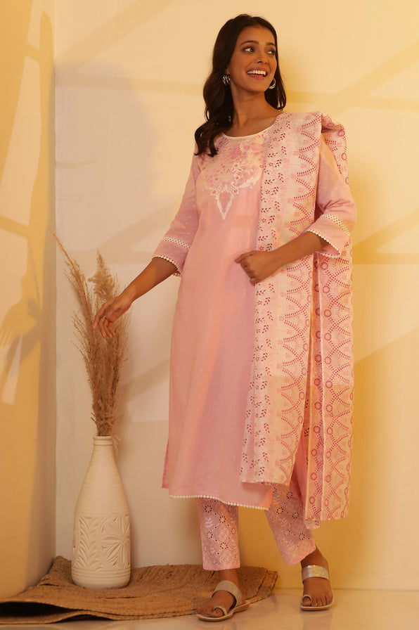 Step into effortless everyday dressing with this pink embroidered cotton kurta, Schiffli pants, and dupatta set from Aurelia.