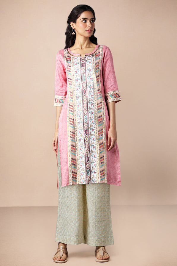 This pink floral printed straight kurta and palazzo set embodies soft femininity and all-day wearability. The light pink tone pairs beautifully with delicate floral motifs, making it a charming pick for spring and summer days. The straight silhouette and palazzo bottoms create a relaxed, breezy fit that works across body types. Ideal for casual brunches, family get-togethers, or even daily ethnicwear, this set is both playful and polished.