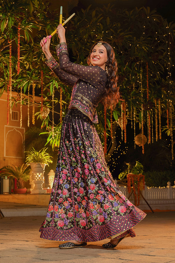 The sleeveless top features bold geometric prints, layered with a sheer black jacket for contrast and style. A matching flared skirt completes the look, making it a perfect choice for festive evenings or special occasions.