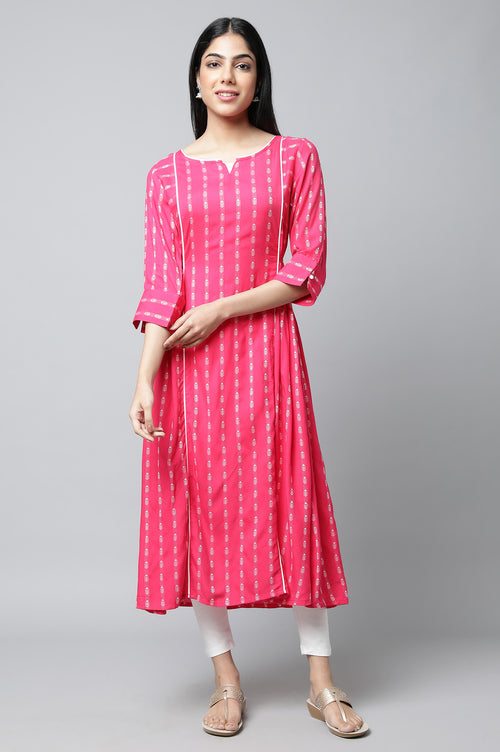 Revamp Your Ethnic Wear Wardrobe With This Stylish kurta Set By Aurelia. The Set Has Pink Printed Long kurta In Round Neck And Paired With White Solid Tights.