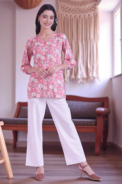 Aurelia brings you a chic and versatile salmon pink kurti that's perfect for the modern woman. This fusion piece combines traditional elements with contemporary design, making it an ideal choice for casual outings. Crafted from 100% modal fabric, this kurti offers exceptional softness and breathability, ensuring all-day comfort. The mid-thigh length and straight cut create a flattering silhouette suitable for various body types. Featuring a v-neck and three-quarter sleeves, this kurti strikes the perfect balance between modesty and style. The woven construction technique ensures durability, while the detail-slit adds a touch of elegance to the overall design. This Aurelia kurti in a beautiful salmon pink hue is a must-have addition to any fashion-forward woman's wardrobe, offering both style and comfort for casual occasions.