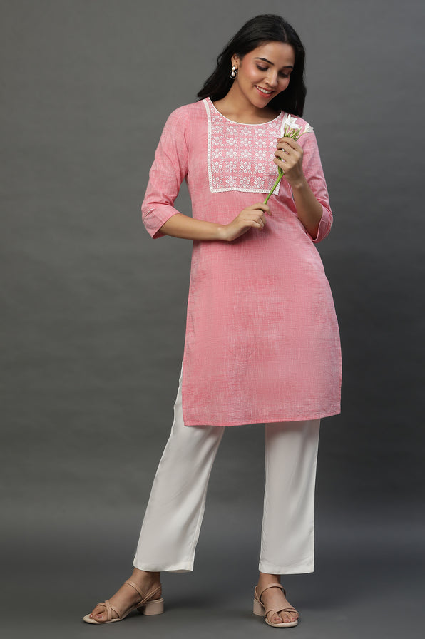 Amp up your casual look in this chic light pick cotton kurta. The kurta has lace on yoke and round neckline. It is designed in straight silhouette and has tie up detail on sleeves.