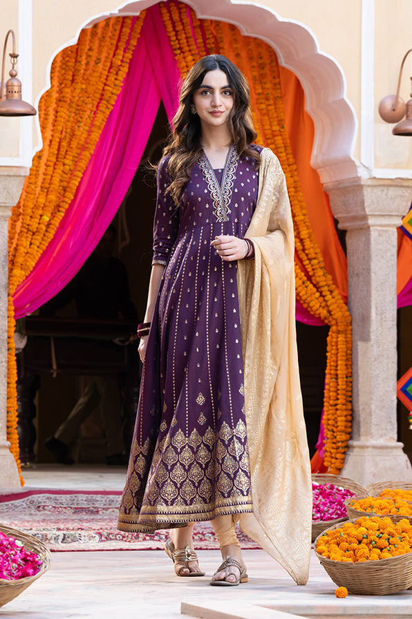 Stylized built-up neckline with inner patch panel inside, with a half circle flare, and long-line length in viscose poly fabric where luxury entwines and makes this piece a heavy festive opulence, gold foil's glam ignites a dual tone masterpiece. Pair it with gold tights along with a gold drape and you are good to go.