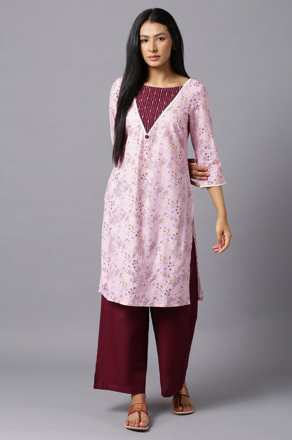 Are You Ready To Amp Up Your Weekend Look? Try This Pretty Pink Floral Printed kurta With Wine Straight Palazzo. This Set Will Give A Feminine Flare To Your Wardrobe. The kurta Is Designed In Straight Silhouette And Has Boat Neck.