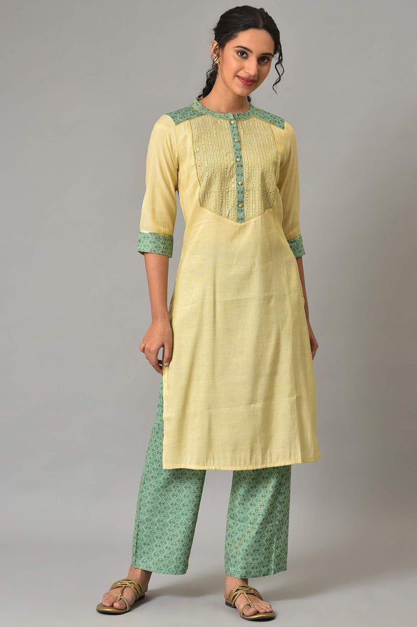 Ivory Embellished kurta In Dual Tone Zari Dobby, With Contrast Shoulder And Cuff Details. It'S Coordinated With Contrast Dobby Pallazo. It Is A Must Have Style For Your Wardrobe.
