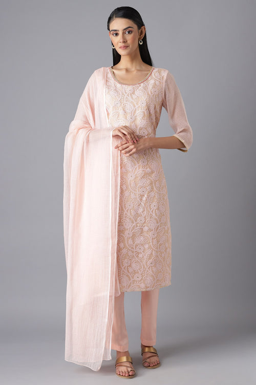 This is simple yet stylish pastel blue kurta set. This 3 pieces set includes straight fit kota fabric kurta embellished with thread embroidery and has embellishement on neckline. It is coordinated with solid trouser pants and dupatta.