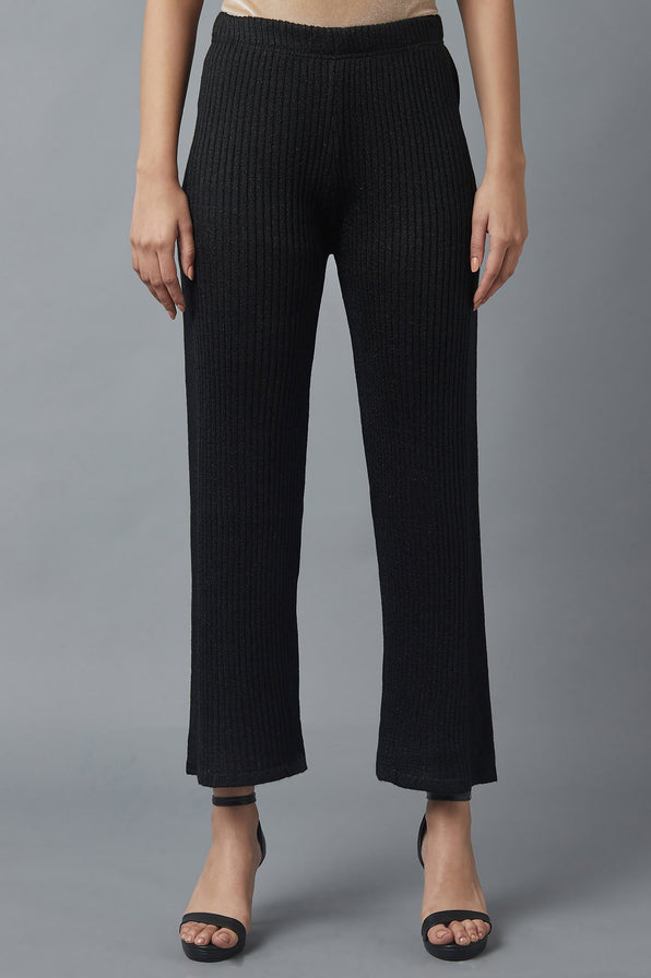 Indulge in cozy sophistication with these black knit palazzos, crafted for effortless style and comfort. The ribbed texture adds a touch of elegance, while the boot-cut silhouette ensures a flattering fit. Designed with an elasticated waistband, these mid-rise palazzos are perfect for casual outings or relaxed evenings. Pair them with winter kurtas or tops for a chic, layered look.